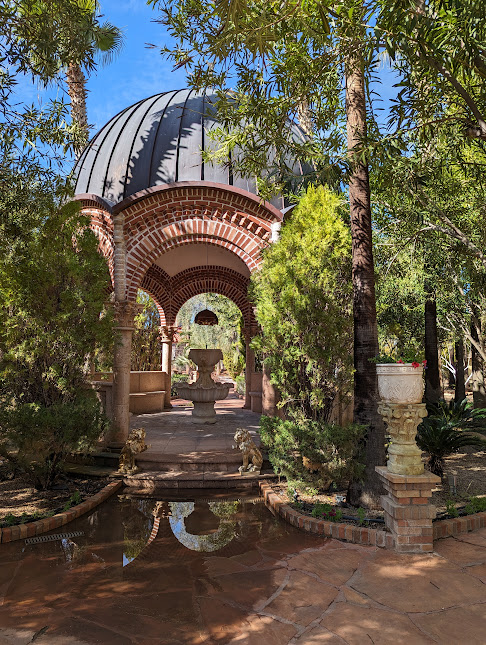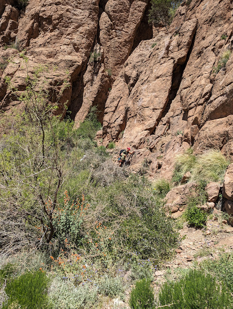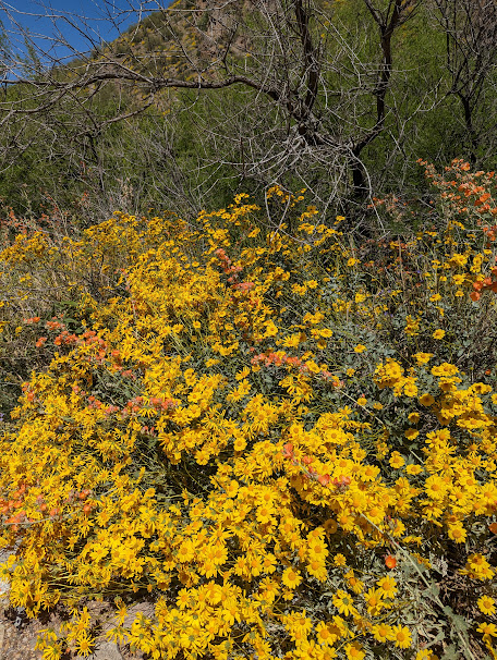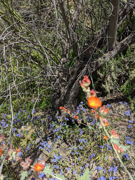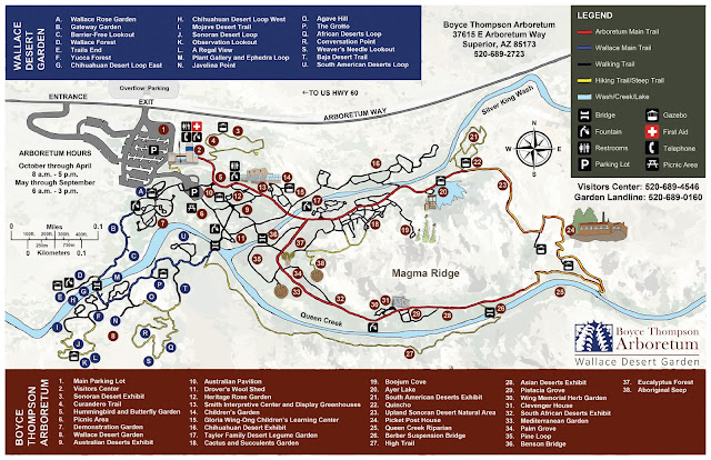 Not long ago Hiking Buddy and I returned to Boyce Thompson Arboretum and the little town of Superior. We got off to an early start because these days it gets very hot very fast. In spite of the climbing mercury, we enjoyed a very pleasant visit to BTA, walking the main loop (fear-o-snakes kept us off the more rugged paths) and visiting the Wallace Collection. This extraordinary collection of over 5,800 plants and trees, originally situated in Scottsdale, began its move to BTA in cars, trucks and semis in late 2015. It was a mammoth undertaking; many of the plants and trees were well established and old, which means moving them was risky and tricky. Well over 90% of the specimens survived the 75 mile journey, a remarkable achievement. Hiking Bud and I had visited the collection shortly after the new 13-acre garden was opened; it was… well, new-seeming. The plants had not yet settled, the shade was spotty. To be blunt it was underwhelming. What a change a few years has made. The new garden is a delight, tempting trails lead hither and yon, signage is okay, and the whole garden has a welcoming feel. The plants are well-established and have filled in the former gaps. The Wallace Collection trails are in blue on the lower left of this map of the entire Arboretum.