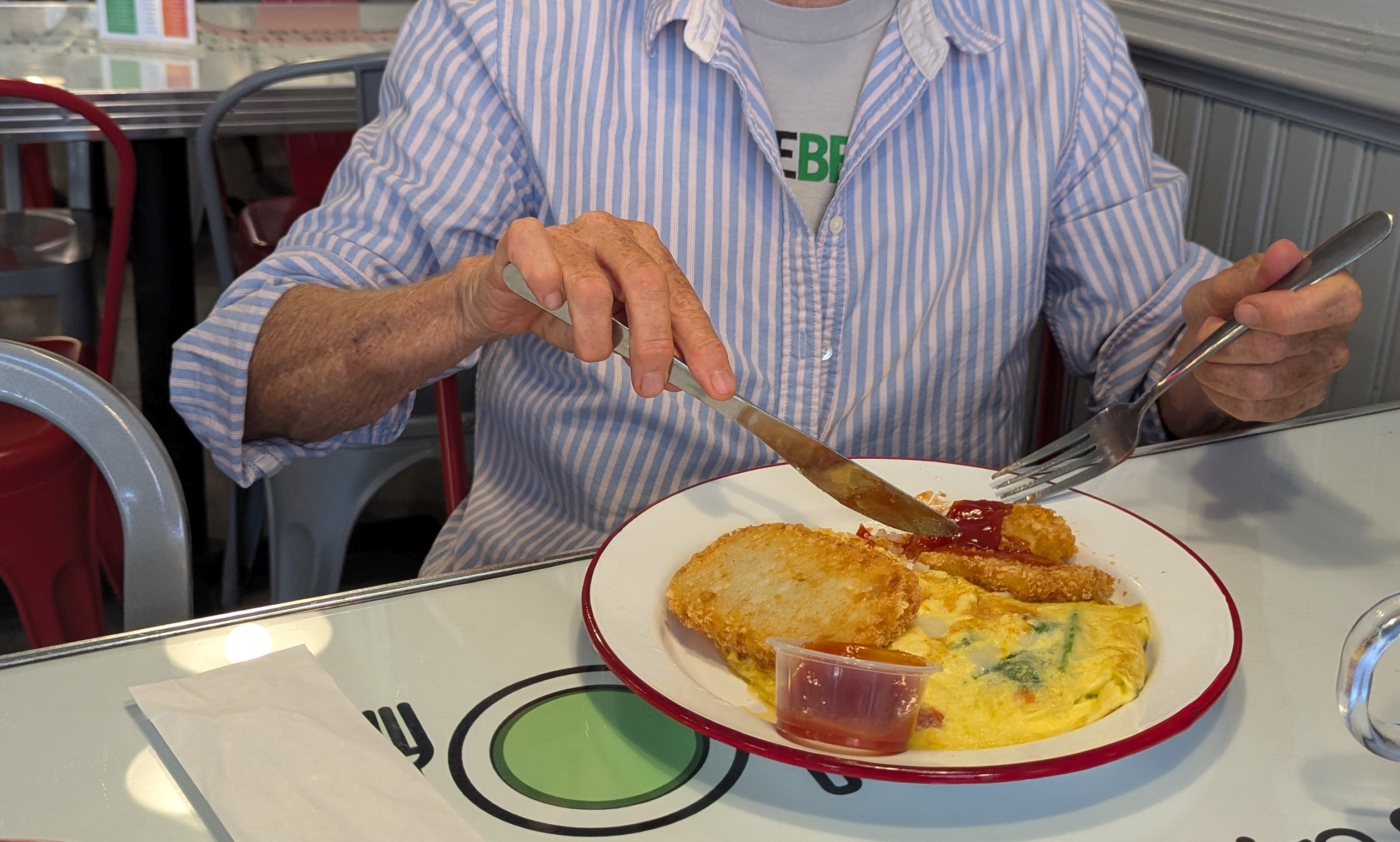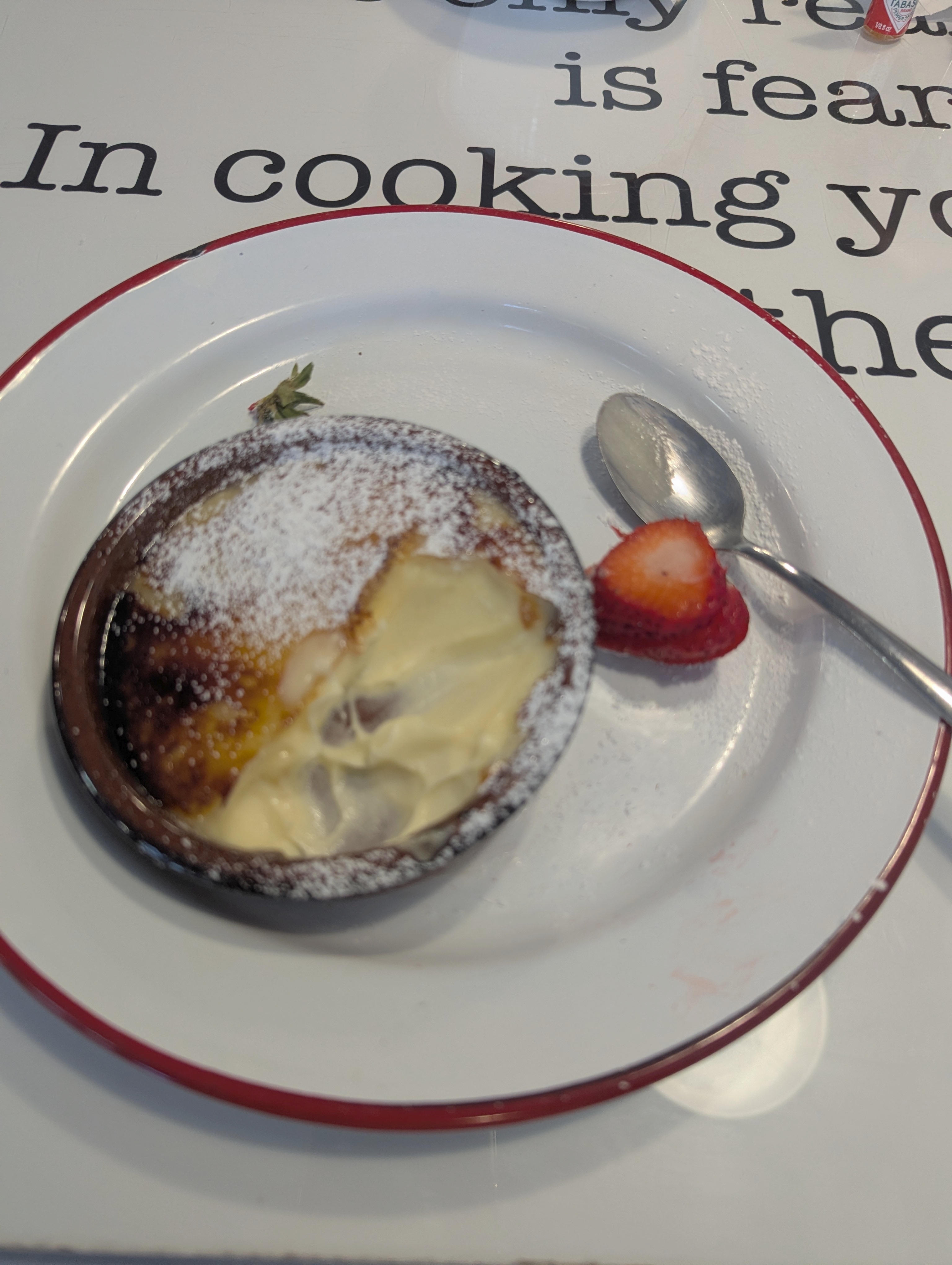 Hiking Buddy had a minimal breakfast before our exertions, so she had a real breakfast. I had had a hearty breakfast, so opted for ‘only’ a crème brûlée, from which, I was assured, all the calories had been removed.