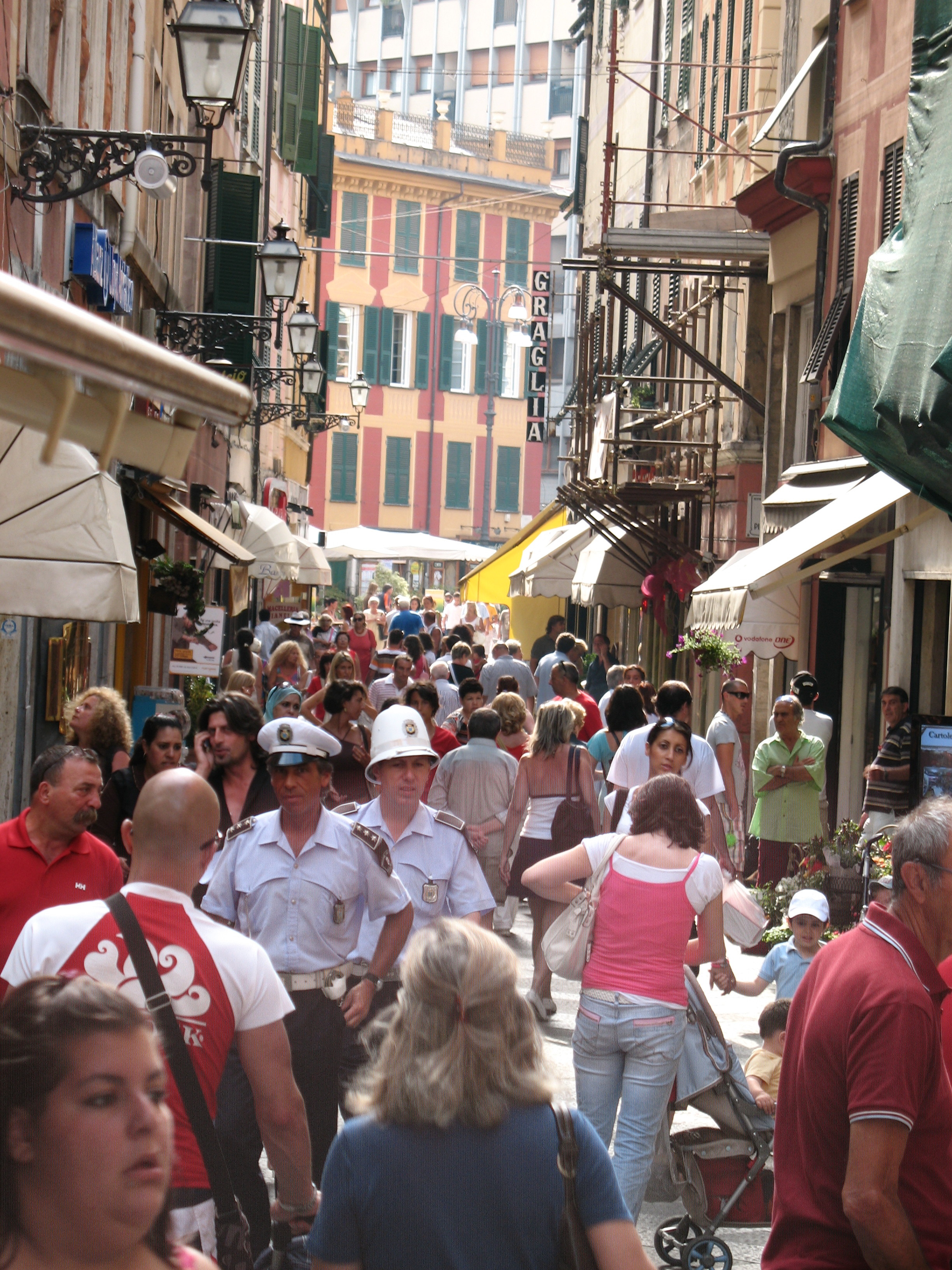 Here’s a pictorial example. The Captain and I had business in the town hall of Zoagli, our neighboring village, last week. They have an exhibition of photos from the December 27, 1943, Allied bombing of the railway bridge there (Happy New Year, everyone!). I can’t give attribution because I couldn’t figure out who took the photos, but I took pictures of them anyway – sorry, they are pics of pics and of poor quality, but interesting anyway. Compare the 1943 photos above of the town center and the railroad bridge to those of the same places taken last Friday, 65 years latter, below. Perhaps if our town looked like the one above we would take to the hills in search of food…