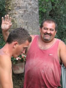 moved in, who blithely put a queen-size wooden futon on his back and carried it down 40 steps to the house. Here he is, waving cheerfully). He sent a recently arrived Romanian buddy who brought along his girlfriend, because she speaks Italian.