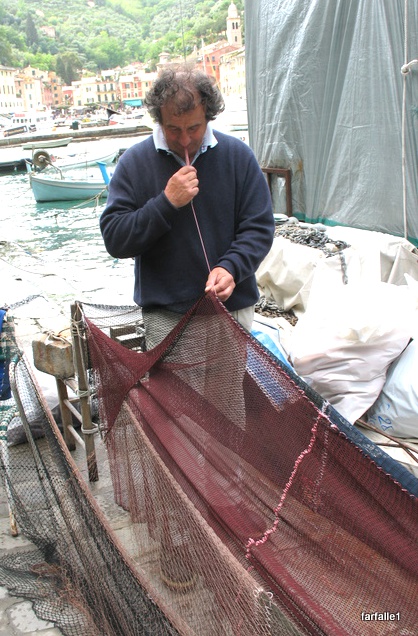 Having pooh-poohed Portofino for years as nothing more than a tourist trap I got my comeuppance on this recent visit. Turns out it still is a quaint little fishing village. We saw a group of four men working with ropes (couldn’t resist skipping over them, men not amused) as well as this fisherman mending his nets. He resignedly agreed to my request to take his picture and admitted that yes, it’s a request he receives pretty often. But he couldn’t have been nicer about it. He uses his mouth to stiffen the string which runs along a sort of large wooden needle. Looks like very fussy work to me, but he made nice even stitches. He said he was a native of Portofino, born and raised. When he was a lad the town had a full time population of about 1,200. Now it is somewhere between 300-500, the rest of the property having been purchased by ‘Milanese’ (which is northern Italian for anyone from outside who comes to your town to buy property. It is most usually used with the adjective ‘ricco.’)
