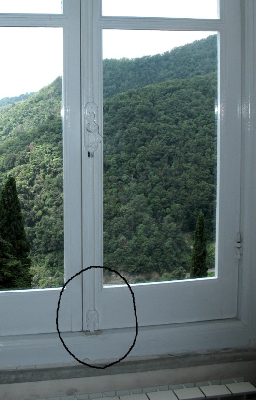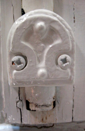 There’s a death head in our studio! Someone’s been doing voodoo with our window trim! It really startled me, because I had simply never noticed it before. Pat, and Gil, you’re correct, it is the bit of hardware through which a meal rod moves to lock the window. Bagnidilucca, you’re close with the door hinge, but not quite (there are some great old hinges in this country, though). Kudos to Kate for seeing the skull. Jennifer and Judy – a tin or bottle opener. hmmmmm. Now I’m going to have to gaze at the picture to try to see what you see! Nope, all I can see is the skull, the terrible skull – ahhhhhhhhh! Hilary – an Eskimo chastity belt? I think this gets the award for most imaginative interpretation of the photo. Or perhaps that should go to you, StatusV. It’s not every day I can contribute to someone’s identity crisis!