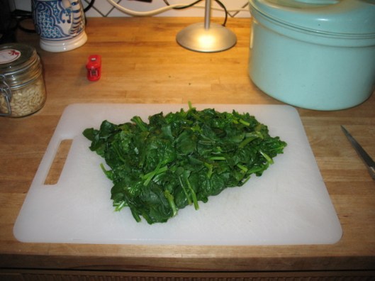 Wash the spinach well and put it in a big stock pot with a little bit of water. Cover and bring to a boil, flipping the leaves around frequently so they cook evenly. Cook them only until they are wilted and dark green; do not finish cooking them. Pour into a colander and let sit for a while or, if you’re in a rush, press the remaining liquid out with a wooden spoon.