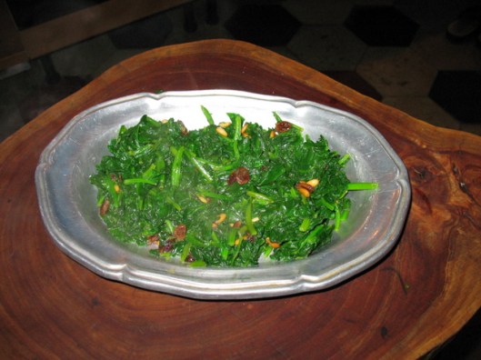 The Ristorante Da Meo Patacca was a great favorite of the TWA crews years ago when the Captain was flying to Rome frequently. One of the most popular dishes of that discerning group of eaters was spinach prepared with garlic, pine nuts and raisins. Yes, raisins. Yum.