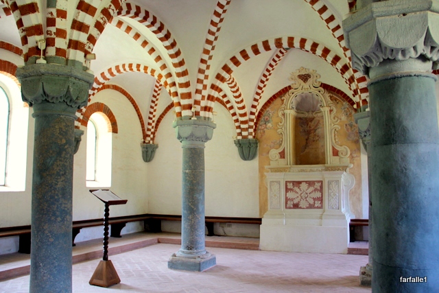 This is the Chapter Room, the Sala Capitolare. The lovely white and red stripes are not medieval; probably they date from the 16th century.
