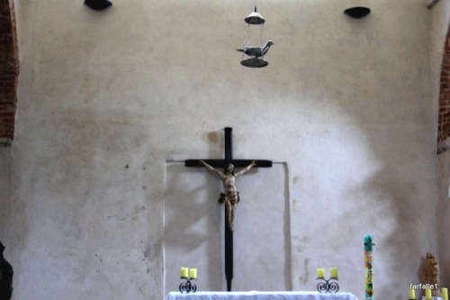Above the altar there is a silver dove with a golden feather in its wing. The silver represents Christ’s humanity, the golden feather his divinity.