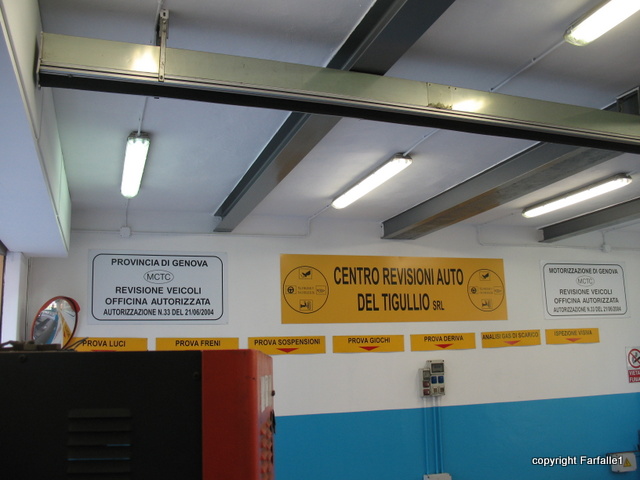 They check all the same things here that they check in the U.S.: lights (luci), brakes (freni), suspension (sospensioni), play in the steering mechanism and the chassis (prova gioca and prova deriva), emissions test (analisi gas di scarico) and finally a visual inspection (ispezione visiva) and in pretty much the same ways: there’s the spinning doodad for testing brakes: