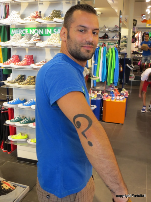 I love looking at people’s body art and, when allowed, photographing it. This genial Genovese sported a design I’d never seen before, simple in style, yet complex and layered in meaning. Maybe. Or maybe not. If nothing else, you could say it is questionable…