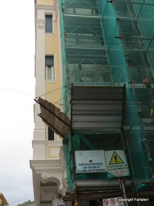 One of the big condominium/bank buildings in Rapallo has been undergoing a face-lift since March of this year. What a job! It’s not just a question of applying a fresh coat of paint. All the old stucco is being removed from the stone building underneath, new stucco applied and, finally, painted.