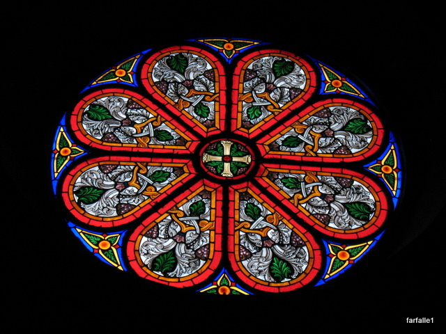 This church, however, is in much better condition than its namesake near Genova. And there is another restoration underway. We saved our visit to the interior for the walk back, and were rewarded with a cool and peaceful respite. This church also is very simple inside, though it boasts a particularly beautiful rose window.