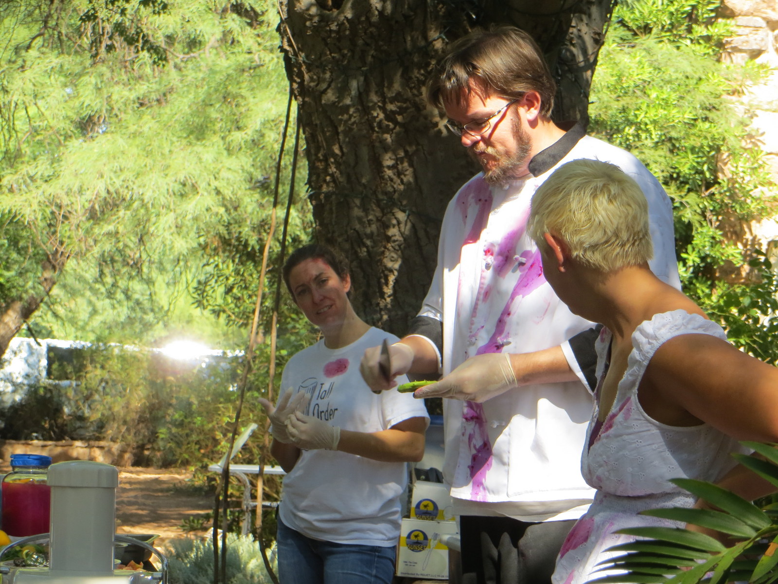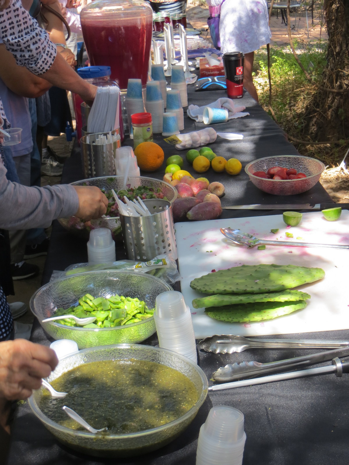 Please excuse the poor quality of this greatly enlarged photo below which I stole from the interwebs and which shows the cafeteria-style lunch counter at Los Altos. Here you can get fresh-made juices and all manner of Mexican prepared food. We opted for tacos, and were delighted to see our tortillas plucked off a board and cooked to order, then made with our requested filling (chicken, please, and for toppings: todo!). We couldn’t resist sides of refried beans (yum), fried bananas, and guac (note to chef: way too salty, have brought home to add more avocados and some sour cream). Sitting at the long picnic tables and dining with strangers is loads of fun, as is seeing what other people are eating – sometimes recognizable, sometimes not. It was the perfect luncheon for hot and weary ladies of a certain age.