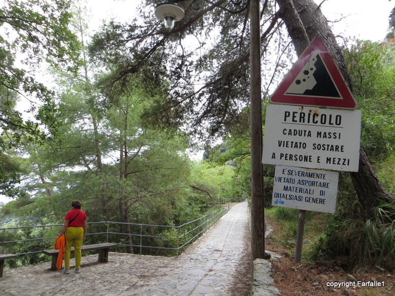 On the beautiful walk from Nozarego, above Santa Margherita, to Portofino we came upon this very confusing place. The top sign says “DANGER – Rockfall – It is prohibited for both people and vehicles to stop.” The one beneath it says “It is severely prohibited to carry off material of any sort.” Then they, whomever they are, thoughtfully provided benches and, farther along the path, a pull-out for vehicles which also offers a splendid view.