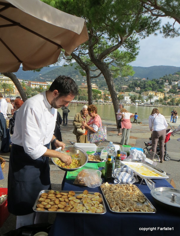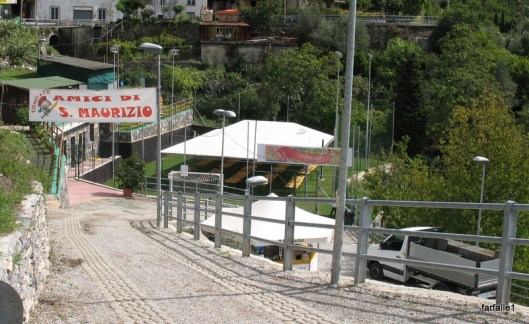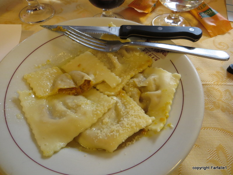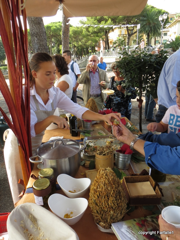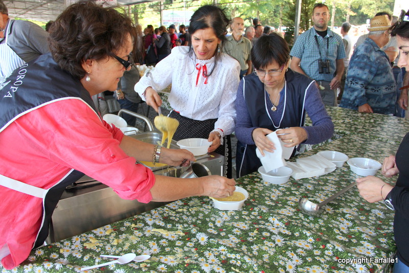 Did someone mention lunch?? It wouldn’t be an Italian festa without a good meal. The featured specialty was polenta cuncia, one of the world’s great comfort foods (you can find a recipe for it here). Basically it is a fairly finely ground corn meal cooked with either water or stock with the local cheese, toma, stirred in at the end. It is rich, hearty and extremely satisfying. The Oropa iteration was dressed with a couple of tablespoons of melted butter, a fine improvement. It took three ladies to serve the polenta – one to glop it in a bowl, one to add the butter, and one to stick in a spoon and hand it to the hungry pilgrim, along with a napkin.