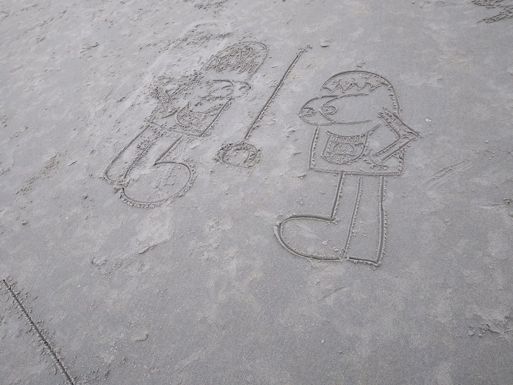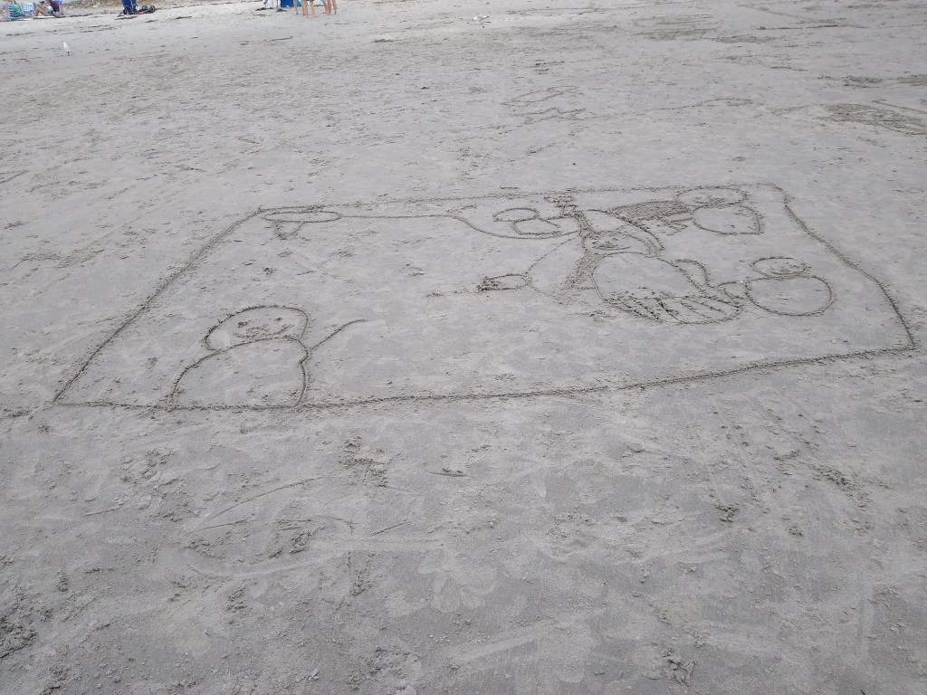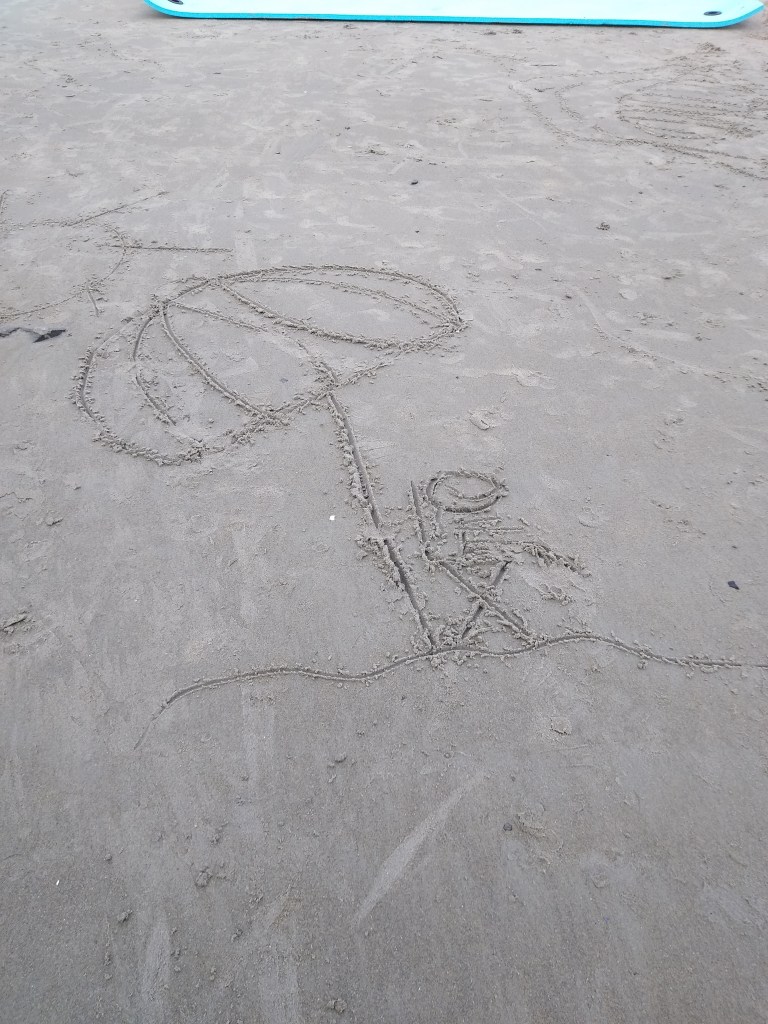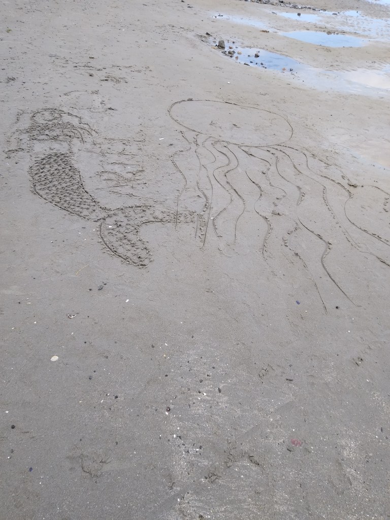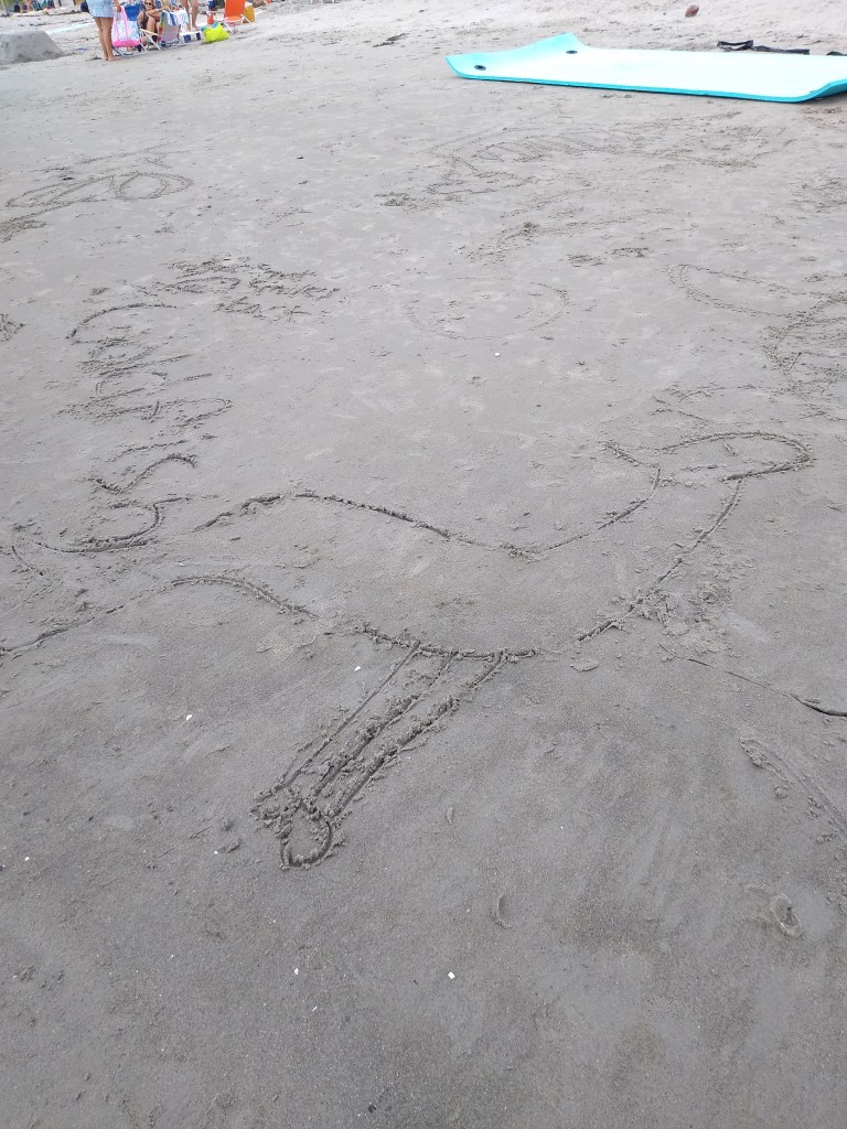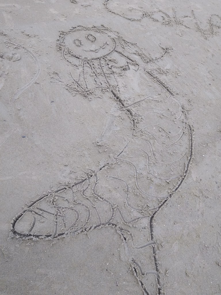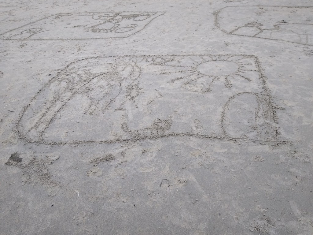 I was charmed by the art left in the sand by many hands. It reminded me a bit of the street art my friend E likes to chase, but this sand art is so much more ephemeral. The next high tide will erase the messages and castles. True, most of this work was not done with a great deal of forethought or attention to detail (we’re on the beach, after all, the waves are calling), but the human urge to communicate through words and images is universal. And you never know when an eight-year-old will fall in love with the medium and do ever more sophisticated art.