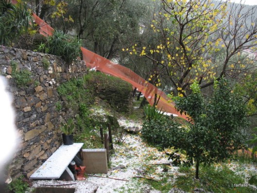 Other parts of Liguria were hard hit by the fierce electrical storms, which went on for hours and knocked out power to many zones of Genova. In our own small area of Rapallo we received some damage. Above us a landslide closed the road that leads to the Valley behind us. Below us trees fell down into the road, damaging a guard rail. Enough were quickly removed to open up one narrow lane for traffic. Seems like very small patooties compared to what’s happened in Genova.