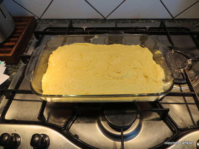 Make the cake batter by beating together the 8 TBL butter and granulated sugar until fluffy. Add the vanilla and the eggs and beat. In a separate bowl sift together the white flour, baking powder and salt. Alternate adding the flour mixture and the milk to the butter sugar mixture mixing well each time (I usually add a third or a quarter of each at a time). Mix well but don’t beat any more after it is well mixed.
