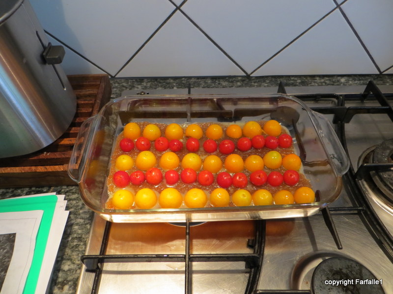 Arrange your prepared fruit in an attractive pattern on top of the sugar/butter mixture with the attractive side down.