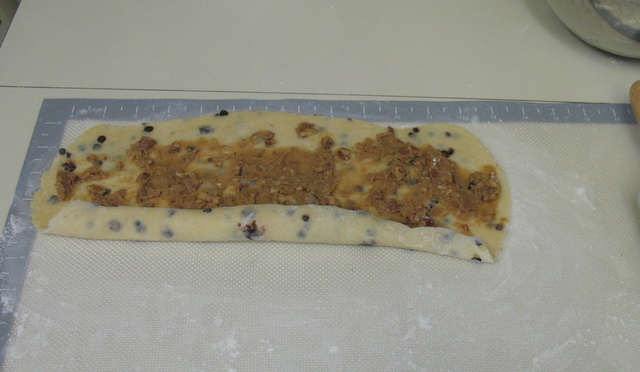 Spread each sheet with 1/6  (or 1/4) of the filling and sprinkle the corresponding proportion of chopped pecans on top.  Roll up, starting with the long side.