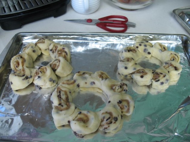 When it’s all rolled up, make a circle, stuffing one end a short distance into the other and pinching the dough to seal it.  Put on a foil lined cookie sheet and, with scissors, make cuts around the wreath not quite all the way through.  Turn the cut pieces so the inside is up:
