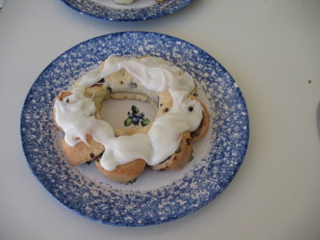 Let your wreaths rise for about an hour.  You can also refrigerate them overnight if you want – if you’ve got enough room in the fridge!  Bake the wreaths at 350 for 20-25 minutes (add 5 or 10 minutes if you refrigerated the formed wreaths).