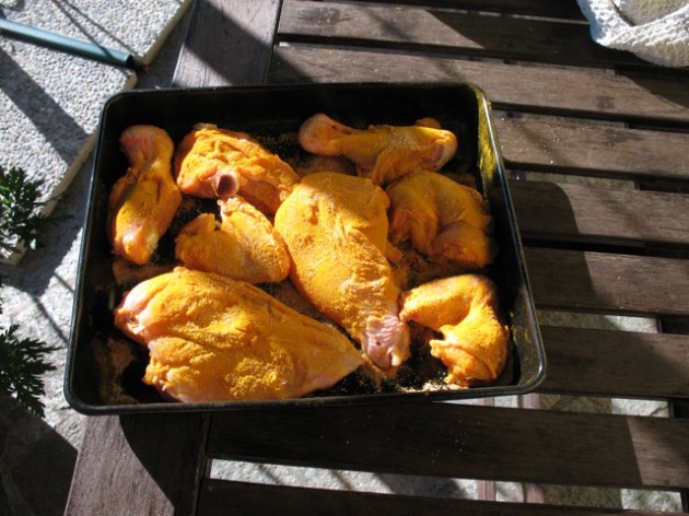 Place a large rack on a large rimmed baking sheet. Mix the sugar, turmeric and cayenne in a small bowl. Sprinkle the chicken on both sides with salt and a generous amount of the spice mixture Arrange the meat, skin side down, on the rack, and let stand at room temperature 2 hours (or cover and chill overnight).