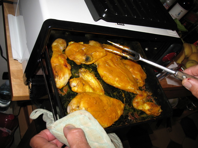 Preheat broiler. Broil the chicken on the rack on the baking sheet until beginning to brown, about 5 minutes. Turn the chicken over and broil until the skin is charred, about 5 minutes. (If using chicken parts, the first broil will take only about 1 or 2 minutes). Remove from broiler.