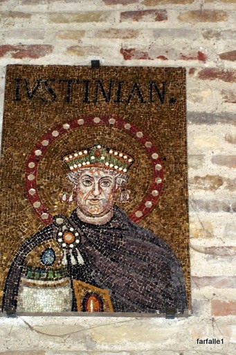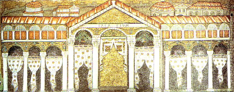Ravenna is most famous for her mosaics, some of which date from the early 5th century CE. Theodoric, leading an army of Ostrogoths, conquered the city in 493, beginning an enlightened and wise 33-year reign which saw extensive land reclamation and an enormous amount of construction. Amongst his projects was his residence, The Palatium (now gone, but we know what it looks like from a mosaic):