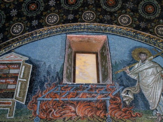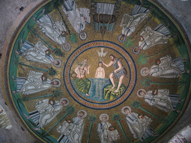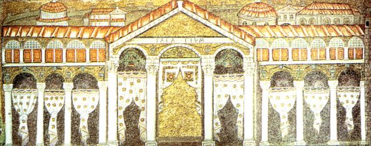 Others of Theodoric’s grand buildings include the Anastasis Gothorum, now the Church of Spirito Santo; and the incredible Basilica Sant’Apollinare Nuovo. (Theodoric was an Arian, that is he followed the teaching of Arius which had been condemned by the Council of Nicea in 325).