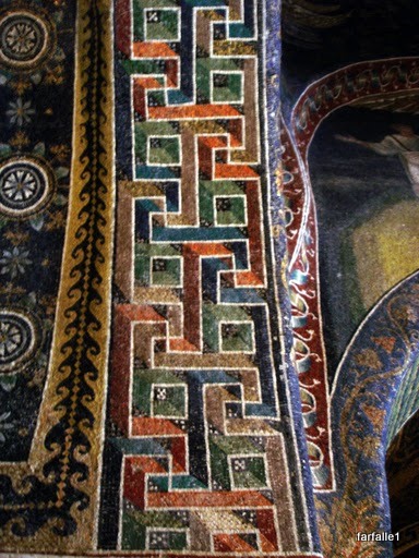 Ravenna’s concentration of Gothic and Byzantine mosaics is astonishing – and breath-taking. There are several different ways to make mosaics; the ones in Ravenna are done in the most difficult way: the stones are placed directly into the wet cement on the wall or floor. A special fast-drying cement was used, so only a small section could be tiled at one time. It’s hard (impossible?) to imagine how the artists could get such subtle variation in color tones, express such personality, and make such complicated geometric patterns when they could do only a little bit at a time and were using only small chips of colored stone, glass or gems for their medium. I suppose they laid everything out ahead of time, but still… it is all amazing and very beautiful.