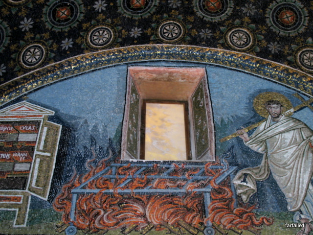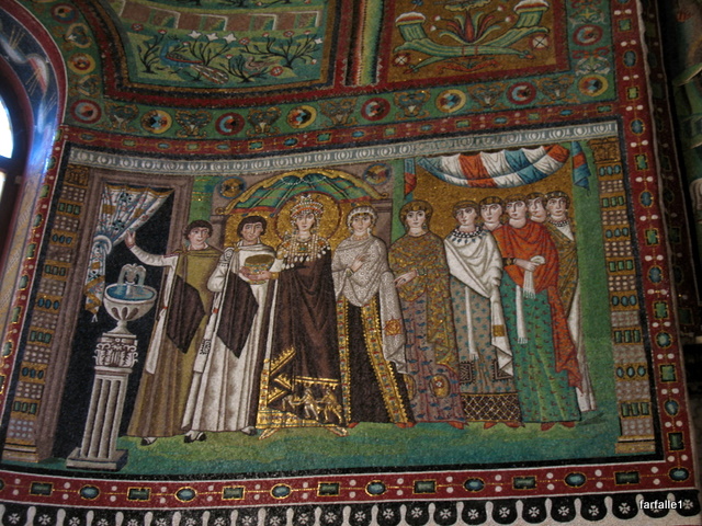 (Interesting fact: after the death of Theodoric and a 9-year reign by his daughter, the Byzantines under Belasarius wrested control of the city from the Ostrogoths. They removed what they could of Gothic images from the mosaics; in the photo above, for instance, figures have been replaced by curtains.)
